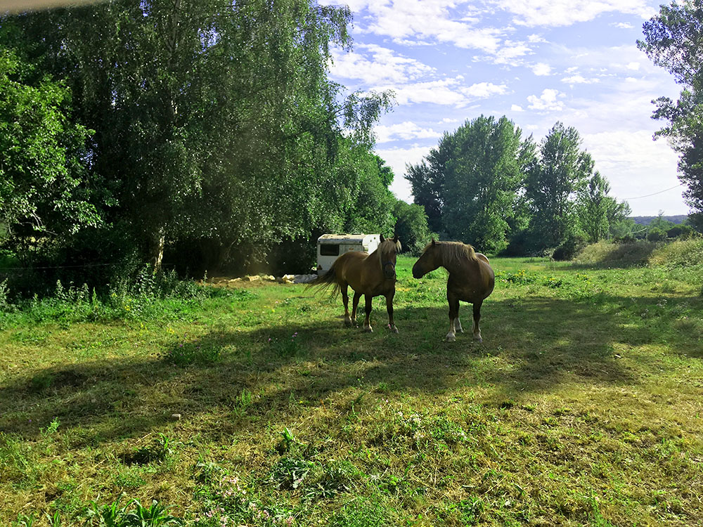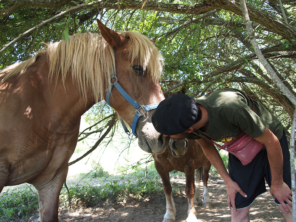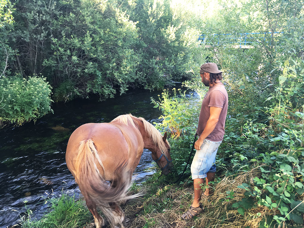 Para evitar el uso de herbicidas, quitan las hierbas con la mano o la azadilla o con la ayuda de las yeguas Blanca y Siria, que también se dedican a recalzar o rehacer el surco cuando ya están implantados los cultivos después del trabajo pesado del tractor.